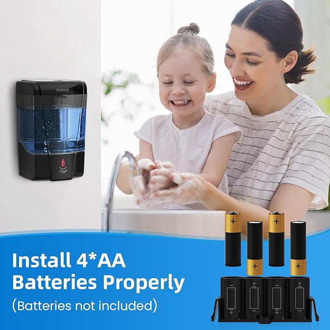 - ✔️ [Space-Saving Efficiency & Energy Conservation]: Maximize your space with our wall-mounted soap dispenser, designed to naturally conserve countertop space. Its sleek design and substantial 600ml capacity provide functionality without compromising efficiency. Powered by 4 AA-size batteries (not included), enjoy up to a year of hands-free soap dispensing without unnecessary energy consumption.