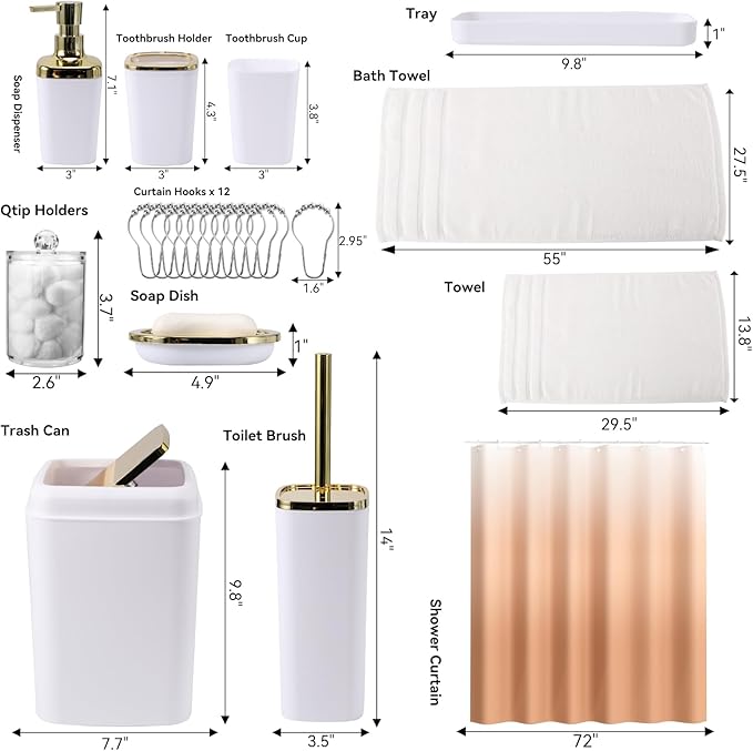 - BATHROOM ACCESSORY SETS COMPLETE:White bathroom accessories includes toothbrush holder, toothbrush cup, soap dispenser, soap dish, bathroom trash can, toilet brush, tray, qtip holders, 1 towel, 1 bath towel and beige gradient shower curtain with 12 stainless steel hooks. It will help you create a complete and unified bathroom style.