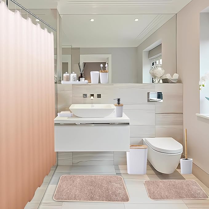 - 【Bathroom Accessories Sets Complete】You'll get everything you need for your bathroom! This includes a soap dispenser, soap dish, toothbrush holder, toothbrush cup, toilet brush with holder, trash can, tray, 2 qtip holder dispensers, ombré shower curtain with 12 stainless steel hooks and 2 super absorbent bathroom rug.