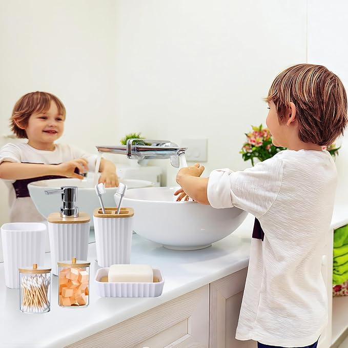 - 【Easy to Clean and Organize】This bathroom accessories sets complete is made of sturdy ABS+PP materials that won't emit odors, making it safe for your family and children to use. Bathroom accessories have a smooth surface that is easy to wipe off or hand wash residue. Simply wash with soapy water and a soft cloth to restore cleanliness. The countertop bathroom set with tray can effectively organize your tabletop, so you don't have to worry about it being untidy again.