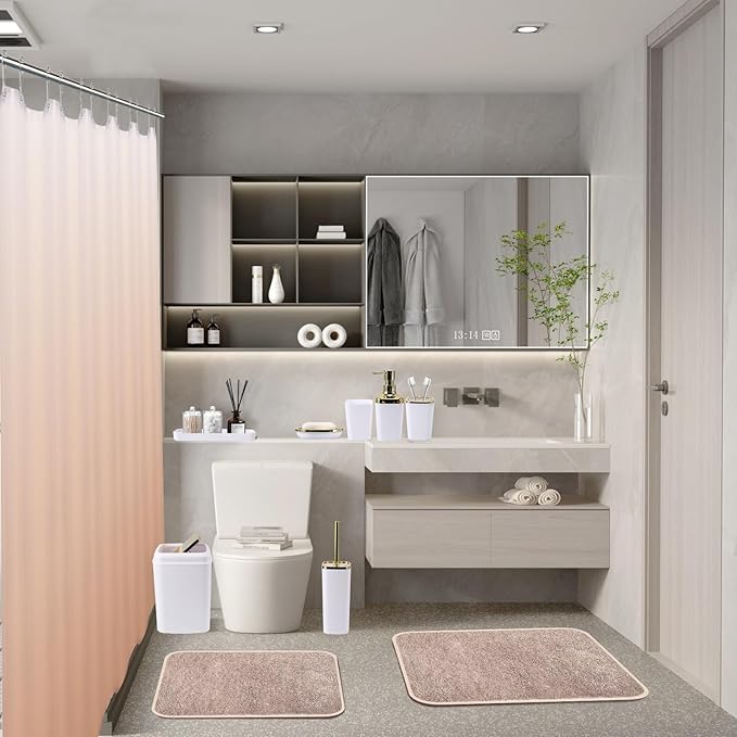 - 【Bathroom Accessories Sets Complete】You'll get everything you need for your bathroom! This includes a soap dispenser, soap dish, toothbrush holder, toothbrush cup, toilet brush with holder, trash can, tray, 2 qtip holder dispensers, ombré shower curtain with 12 stainless steel hooks and 2 super absorbent bathroom rug.