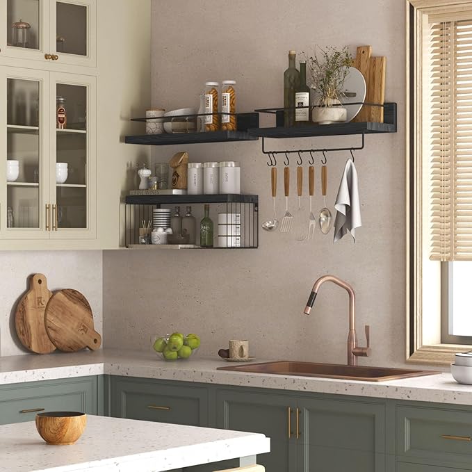 Bathroom Shelves Over Toilet for Wall, Floating Shelves with Storage Basket Paper Holer for Kitchen Living Room, Bedroom & Classroom, Set of 3 (Black)
