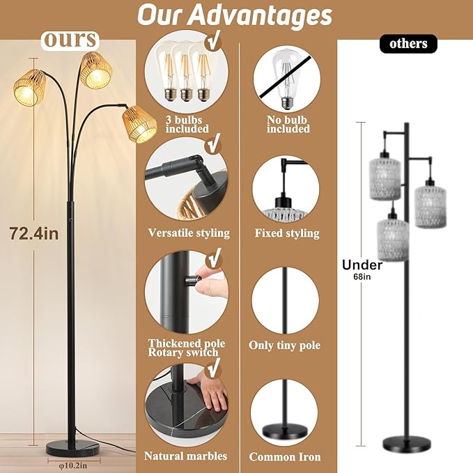 - 【Ease and Convenience】Our arc floor lamps for living room, designed as bohemian floor lamp , are crafted with user-friendliness in mind. Easy to assemble and including three light bulbs, they enable you to brighten up your space right away without the need for additional purchases