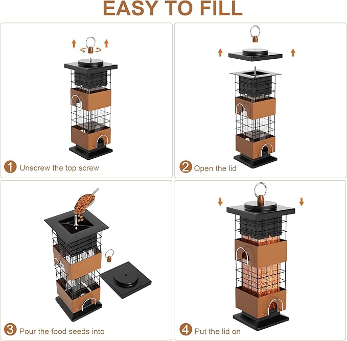 - Easy To Fill: Bird feeders for outdoors squirrel proof with a cubic clear seed compartment in the middle, holds approximately 2.5 pounds of different feeder seeds. There are drainage holes at the bottom of the outdoor bird feeders to keep the seeds dry and ventilated, clear plastic seed tube lets you see when it needs to refill seeds. Simply turn to unlock, lift the lid and pour in seeds for easy refill.