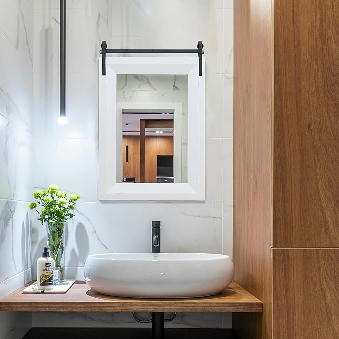 - 【Premium Solid Wood Frame】The frame of the farmhouse mirror is made of premium fir wood with oil-based paint to prevent scratches and ensure durability and resistance to moisture. The solid wood frame gives the rustic mirror a sturdy and authentic look, adding a touch of farmhouse appeal to the bathroom, living room, powder room, entryway, hallways, bedroom, dressing room, garden, courtyard, etc.