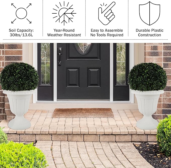 Pure Garden Outdoor Planter 2-Pack - 16x18-Inch Urn Planters - Plastic Plant Pots for Indoor, Outdoor, or Front Porch Decor - Flower Pots (White)