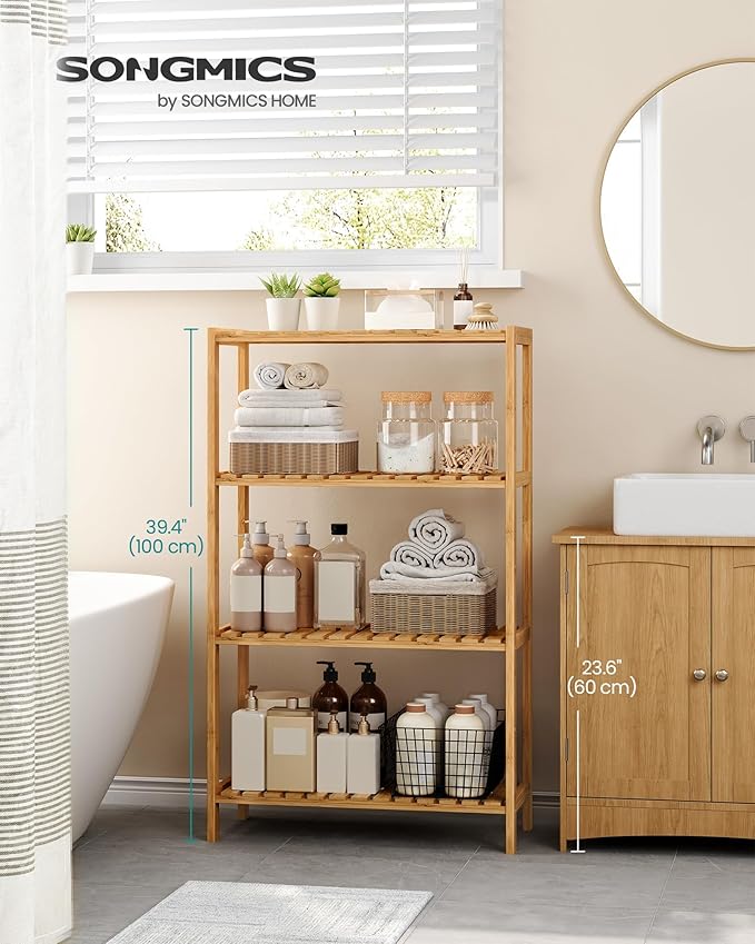 SONGMICS Bamboo Storage Shelf, 4-Tier Shelving Unit, Multifunctional, in The Entryway, Bathroom, Living Room, Balcony, Kitchen, 10.2 x 23.6 x 39.4 Inches, Light Bamboo UBCB034Y01