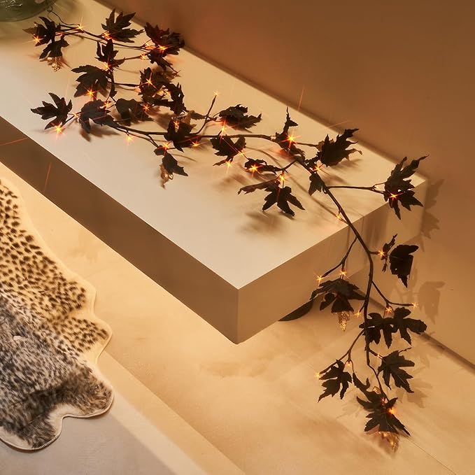 Birchlitland Halloween Black Maple Garland with Lights Timer 48 LED Orange and Warm White Fairy Lights, Battery Operated for Indoor and Outdoor Halloween Party Decoration