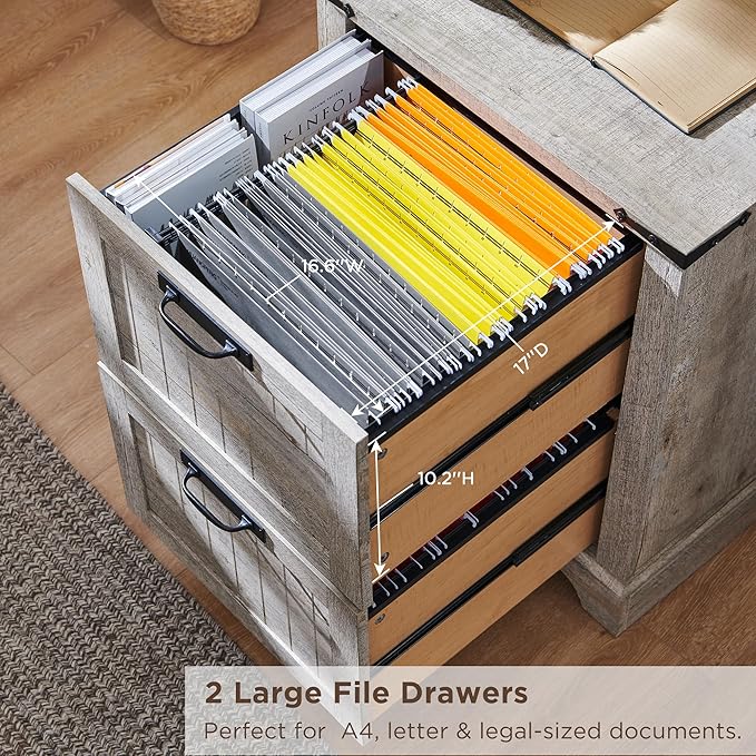 - Two Large File Drawers: The office bookshelf has two large and deep file drawers (overall size is 16.6"W*17"D*10.2H) and are equipped with adjustable file hangers to accommodate both legal-or letter-sized documents. Drawers are set on full-extension, metal ball-bearing glides for smooth movement and easy removal.