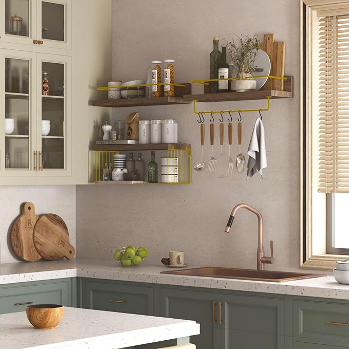 Bathroom Shelves Over Toilet for Wall, Floating Shelves with Storage Basket Paper Holer for Kitchen Living Room, Bedroom & Classroom, Set of 3 (Brown and Gold)