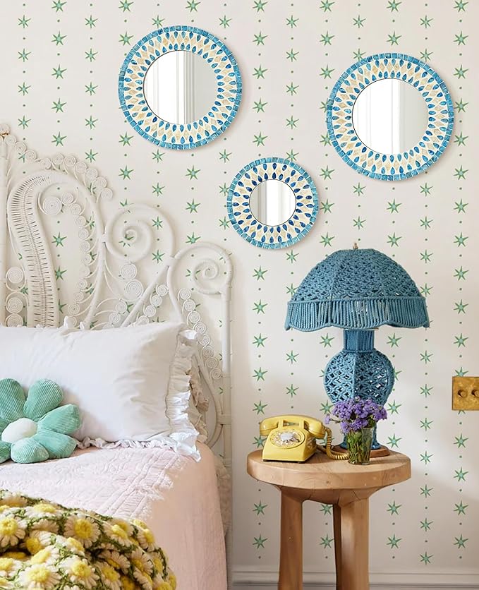 - HANDMADE, NATURAL WALL DECOR - Handcrafted from real mother of pearl by our experienced craftsmen, this unique mirror wall art set adds distinctive flair to your living or working space. Blue and creamy white tone makes this wall mounted mirror fit in coastal, contemporary, retro and any other styles effortlessly, delivering maximum comfort and tranquility. [Note: Because the cut pieces are put on individually by hand, items received may be slightly different from pictures shown]