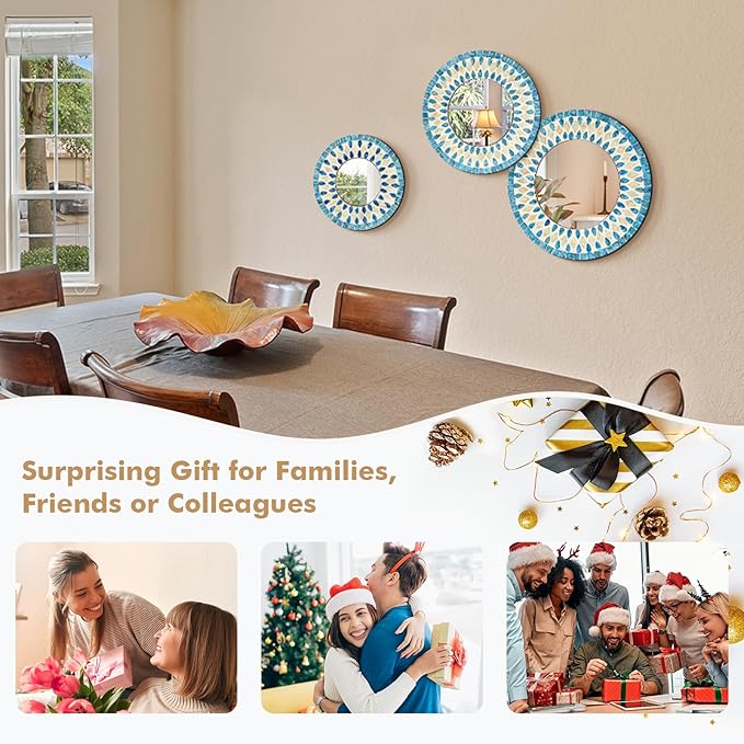 - VERSATILE MIRROR WALL DECOR: Whether moving into a new home or looking for a special gift, this beachy decorative wall sculpture set is an unbeatable choice. Perfect for home office, hotel or coffee shop. It makes a lovely addition to living rooms, dining rooms, bedroom, bathroom, nursery, guest room, entrances, porch, fireplace, and by windows. Plus, a warm gift for families, friends or colleagues on holidays, birthdays, anniversaries, housewarming, Christmas or Thanksgiving