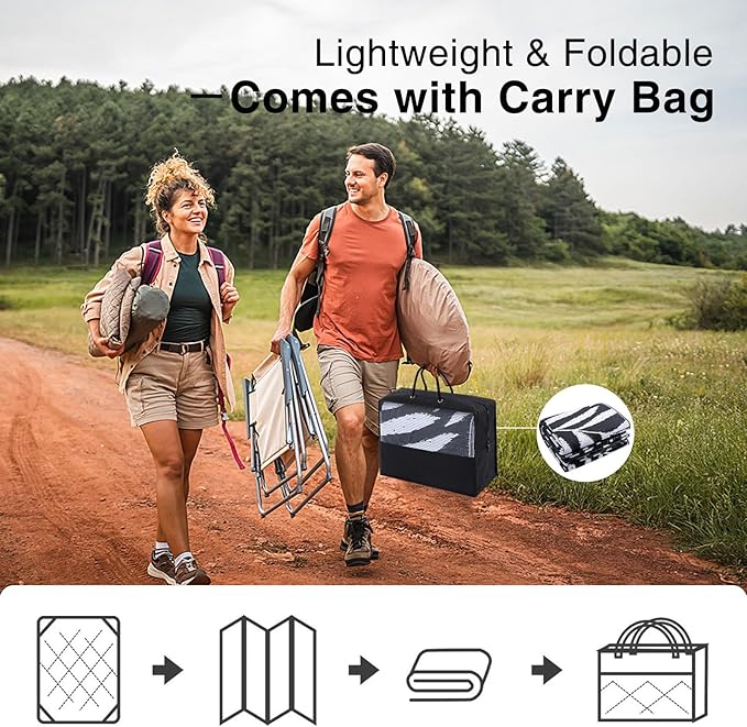 - Portable & Convenient: Lightweight and foldable, our waterproof rugs are easy to transport and store, making them ideal for travel and camping. They even come with a matching carry case for effortless portability.