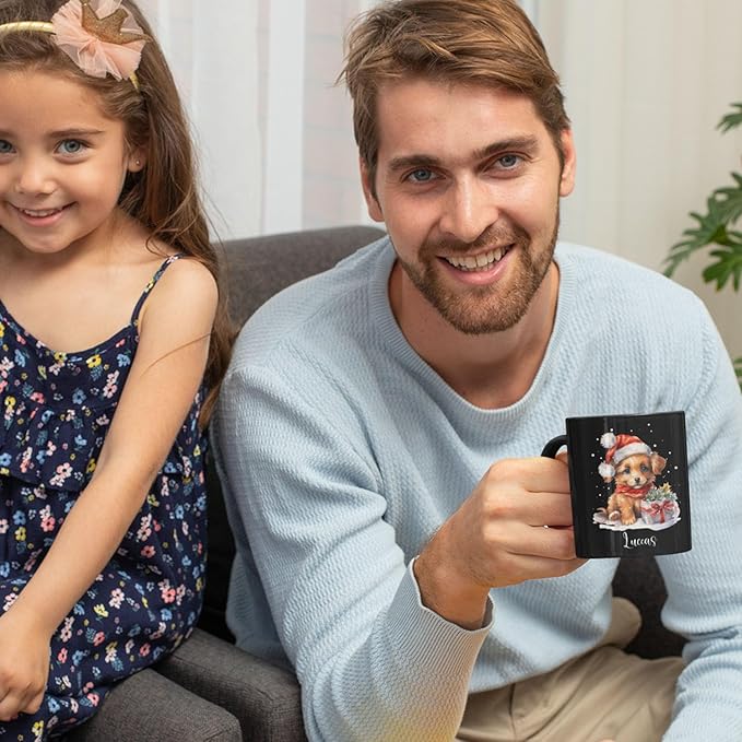 - 💝 UNIQUE DESIGN MUG: Bring holiday joy to any pet lover with this "Personalized Name Xmas Puppy Cup" featuring a cute puppy in a Santa hat design. Click "Customize Now" to add a name, making it a great personalized gift for the holiday season. This black ceramic mug is ideal for sipping warm drinks in cozy winter settings.