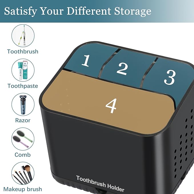 - DETACHABLE DESIGN: The toothbrush holders for bathrooms has a removable and compartmentalized design, with a total of 4 slots, it has enough capacity to store different kinds of bathroom storage, which greatly saves the storage space on the bathroom countertop. The removable design of the electric toothbrush holder is also easy for you to clean.