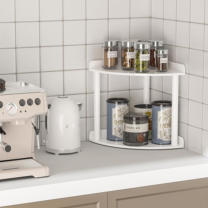 - Space Saver: The countertop organzier corner shelf rack is a perfect space saver in your house. 2 tier design will help you to organize your toiletries, cosmetics, skincare, perfume or spice jars very well. You will get a very tidy counter. Say goodbye to mess!