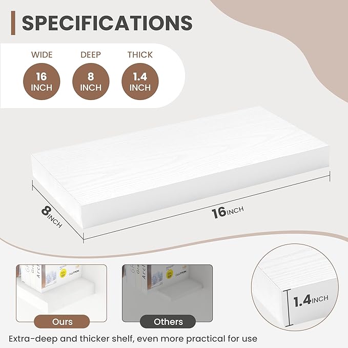 - [STABLE & SECURE INSTALLATION]: Equipped with a robust, hidden mounting bracket, these 16 inche floating shelves provide solid support for your items. Designed for easy, secure installation, they include all necessary hardware for a firm, wobble-free setup, so you can confidently display decor, photos, or functional items with style.