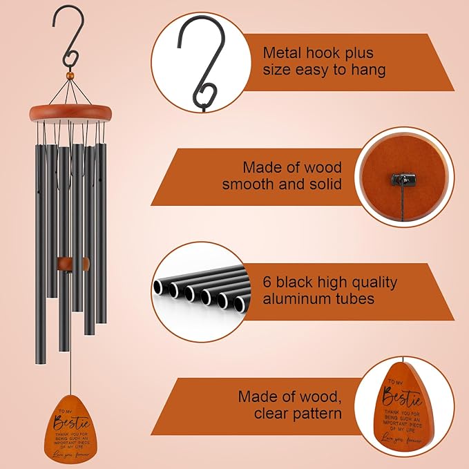 - Soothing Sounds for Relaxation: With its precise design and six thick-walled aluminum tubes, this wind chime produces soothing melodies, creating a serene atmosphere that promotes relaxation and tranquility. It's a perfect way to express your love and strengthen your bond with your friend, bestie.