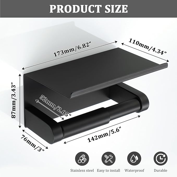 - LARGE STORAGE SHELF: The toilet paper holder with shelf is 6.82 inches long and 4.34 inches wide, large enough to hold a variety of items such as cell phones, Bluetooth speakers, ashtrays or air fresheners. The plastic spring-loaded rod measures 5.6 inches long and fits most sizes of toilet paper rolls.