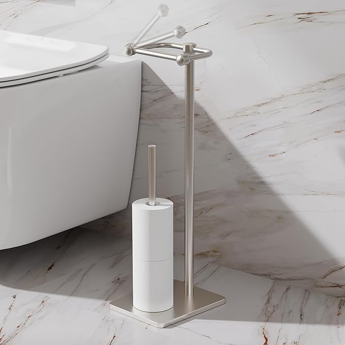 - [Weighted Base and Anti Slip Design] The weighted base of the brushed nickel toilet paper holder stand ensures stable standing.The toilet roll holder stand 4 protruding points at the bottom not only prevent slipping but also keep the bottom dry