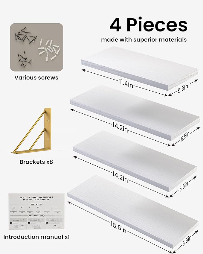 BAYKA Wall Shelves for Bedroom Decor, Floating Wall Shelves for Living Room Kitchen Storage, Wall Mounted Rustic Wood Shelves for Kids Books, Corner Shelf for Bathroom(White and Gold,Set of 4)
