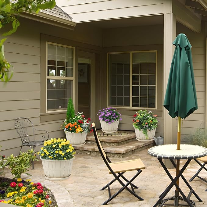Quarut 14 Inch Plastic-Flower-Pot-for-Indoor-Plants, 4 Pack Large Outdoor Planter Pot with Drainage Holes & Saucers, Resin Decorative Garden Pots Planters(White)