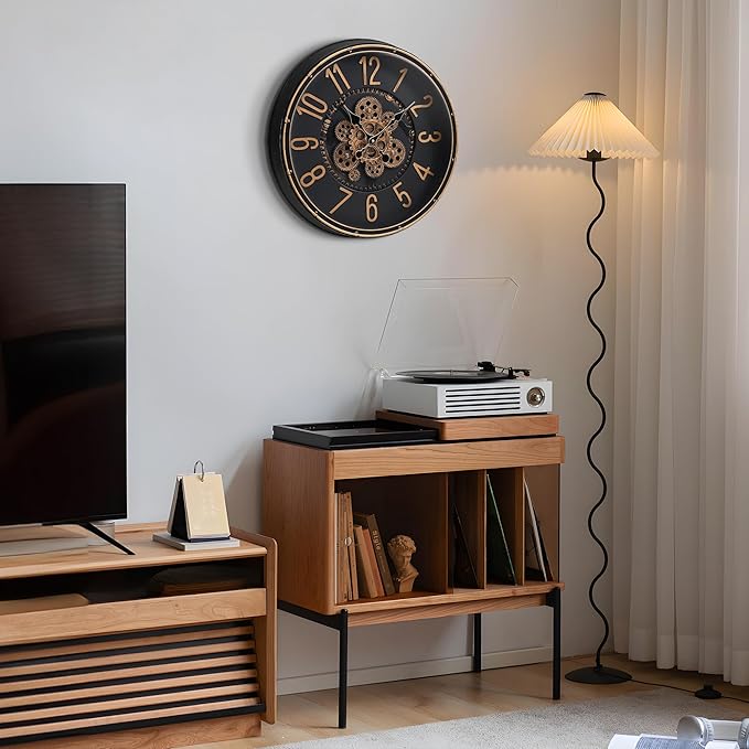 - [Easy to Read and Hang] Size in 20" Diameter * 3" Thickness,this black and gold clock made of high-quality metal, HD glass-Clear glass lens protects the clock face from dust. It operates on 1 AA for clock operation; 2 additional AA for moving gears, Gears move independently of hands ,(NOTE: Battery not included)A hole for hanging is in the back, easy to hang.