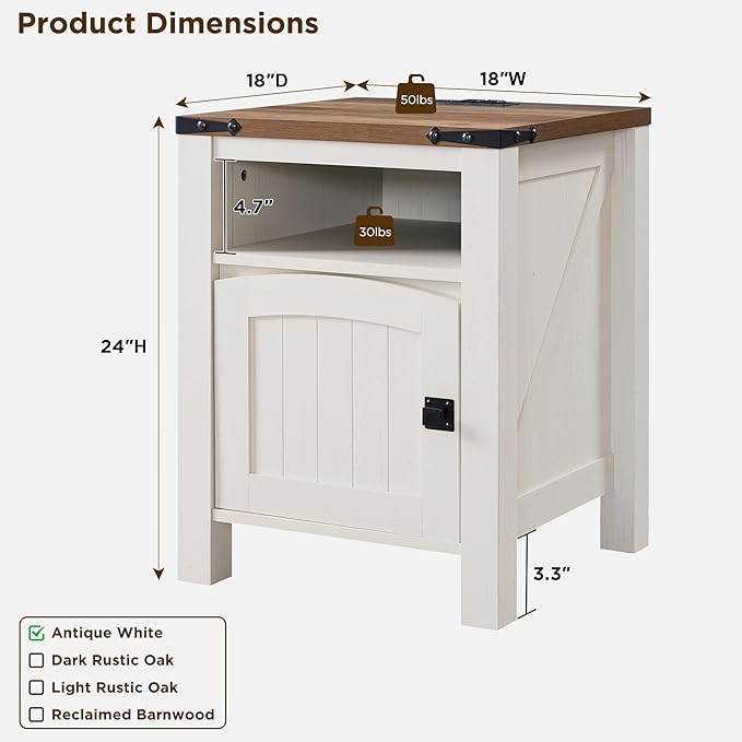OKD Farmhouse Nightstand with Charging Station, 18" Rustic End Table with Adjustable Storage Shelf, Wood Rustic Wood Sofa Side Table for Bedroom