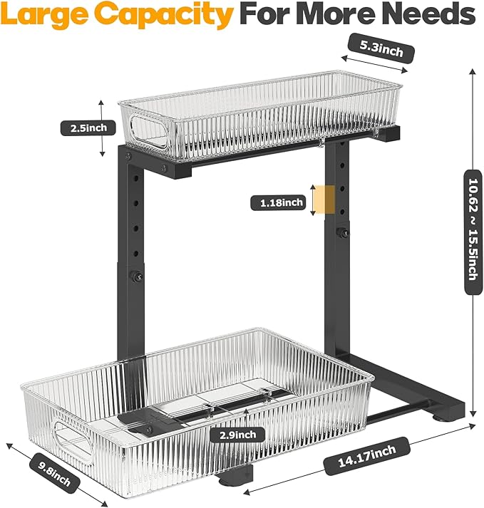 - 【Durability and Elegance】This under sink organizer combines a sturdy iron frame, 2.5cm wide and 1.2cm thick, with elegant acrylic baskets to bring both durability and sophistication to your space. The robust construction promises long-lasting reliability, while the modern, transparent design adds a touch of refinement, effortlessly blending practicality with beauty.