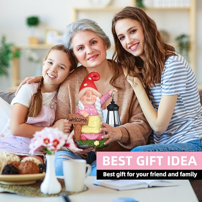- Garden Gnome Decor: The gnome statue hold a welcome sign in its right hand and a solar-powered lantern in its left. The tall size of the gnome makes it stand out indoors and out; place it on your doorway, porch, or yard, and the big, cuddly gnome will warmly welcome every guest.
