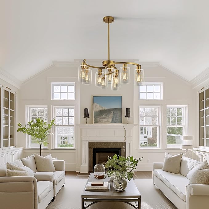 - [Modern Style]: Gold chandelier light fixture has 3 arms that radiate outward from the central arc, presenting a simple but not simple beauty. The body of the modern farmhouse chandelier is made of high quality metal with a fine polished surface and brushed. The clear glass shade not only ensures the soft scattering of light, but also complements the cold and hard texture of the metal, making the whole gold hanging light fixture both powerful and delicate. The downward-facing glass shade does not easily accumulate dust and is easy to clean.
