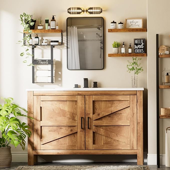 - Farmhouse Vibe: Transform a small bathroom into an orderly space with chic shelves