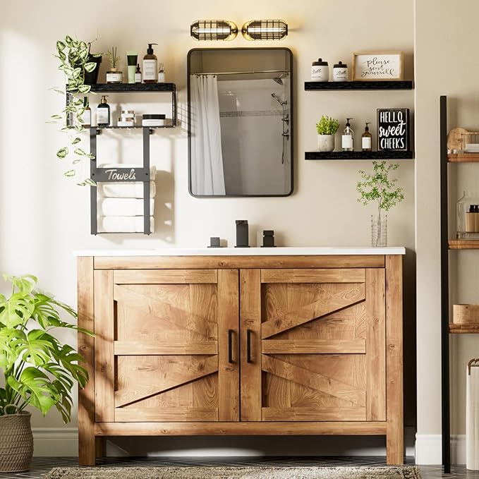 - Farmhouse Vibe: Transform a small bathroom into an orderly space with chic shelves