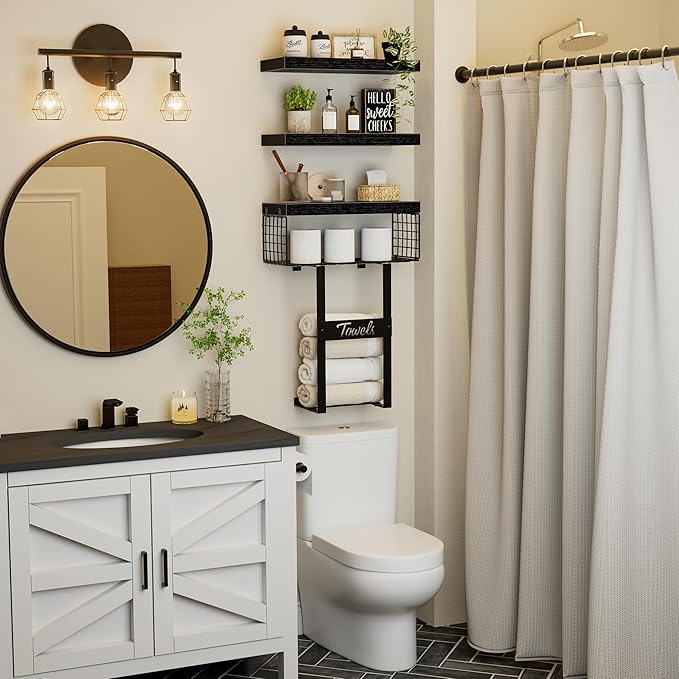Bathroom Shelves Over Toilet - Floating Shelf for Wall Above Toilet Towels Holder Small Farmhouse Decor Shelves (15.7 inch, Set of 3, Black)