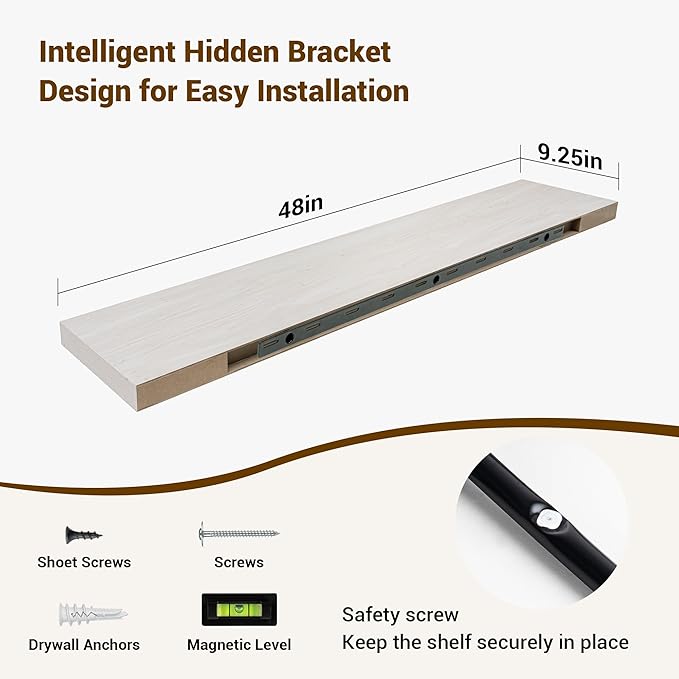 48 Inch Floating Shelves, 48"x9.25"x1.5" Inch Deep Floating Shelves for Wall, Wooden Shelves for Bathroom, Bedroom, Living Room, Cream White Oak