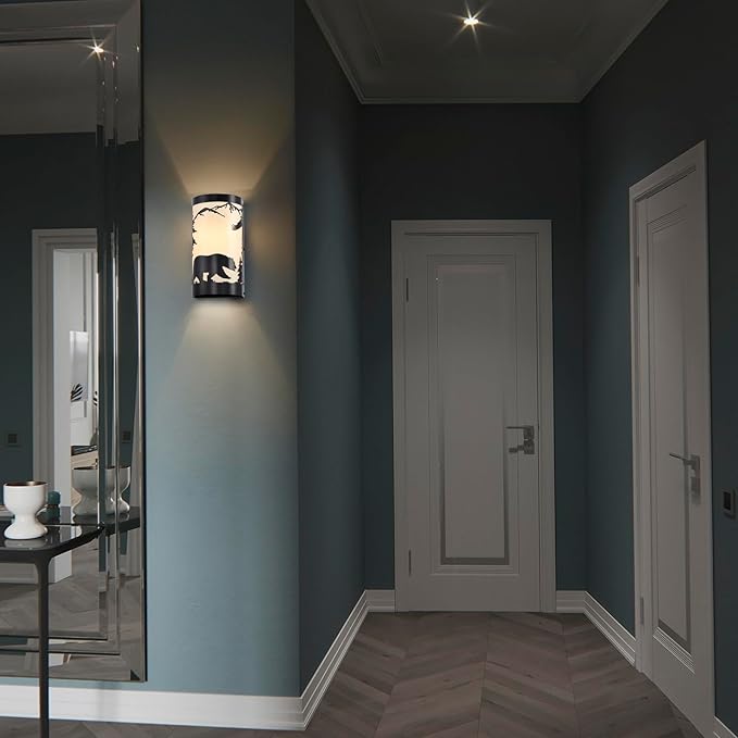 - Rustic Design: Black wall sconces set of two is crafted from durable matte black metal,featuring intricate forest elements and a bear silhouette,white parchment paper adds a soft,warm glow,enhancing industrial aesthetic of the vintage wall sconce