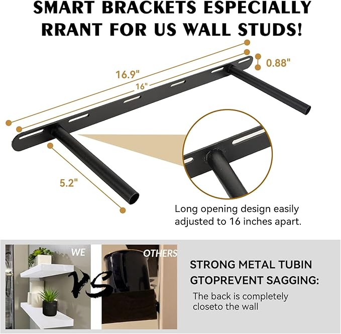 - NO SAGGING! MORE PERFECT FOR AMERICAN WALLS : BGMG premium wood shelves are built to last and hold up to 50 pounds using our smart brackets designed specifically for American wall studs, which are typically 16 inches apart! The brackets warp slightly upward to prevent the shelves from sagging and falling off