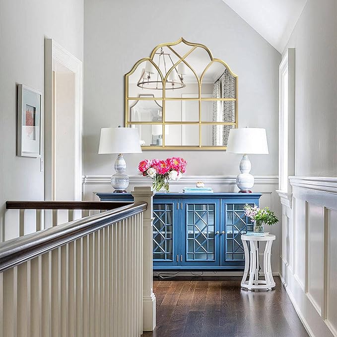 - Unique Design: This long cathedral mirror window features a Moroccan-inspired arch. Golden metal frame and windowpane make this grid mirror sturdy, which touch to kinds of wall home decor stlyes.
