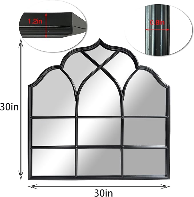 - GOTHIC DESIGN: Elegant arched window-style mirror with cathedral-inspired framework featuring a black metal frame and divided glass panels.Matte Black metal frame and windowpane make this grid mirror sturdy, which touch to kinds of wall home decor styles