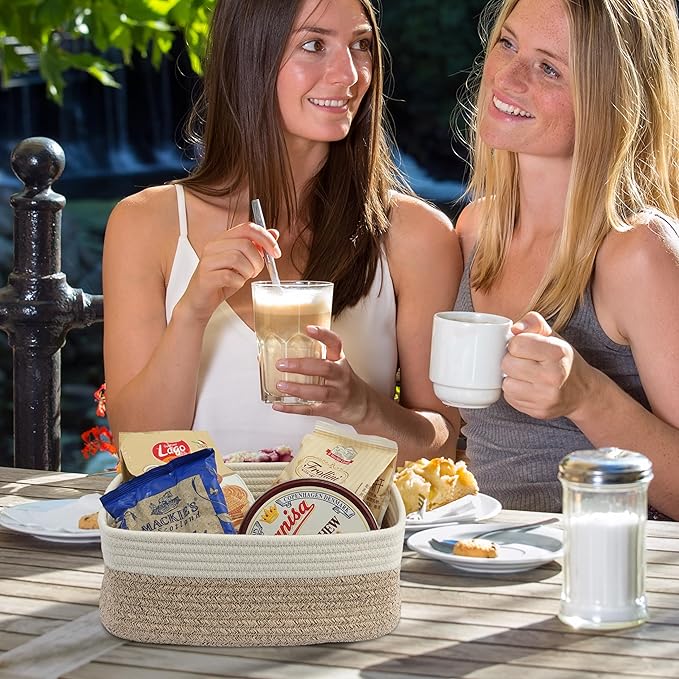 Small Woven Storage Baskets 12“X8”X5“ Decorative Rope Bins for Organizing Shelves, Closets, and Toys, Empty Gift Baskets, Cute Organizer Basket for Home and Office (white and brown regular)