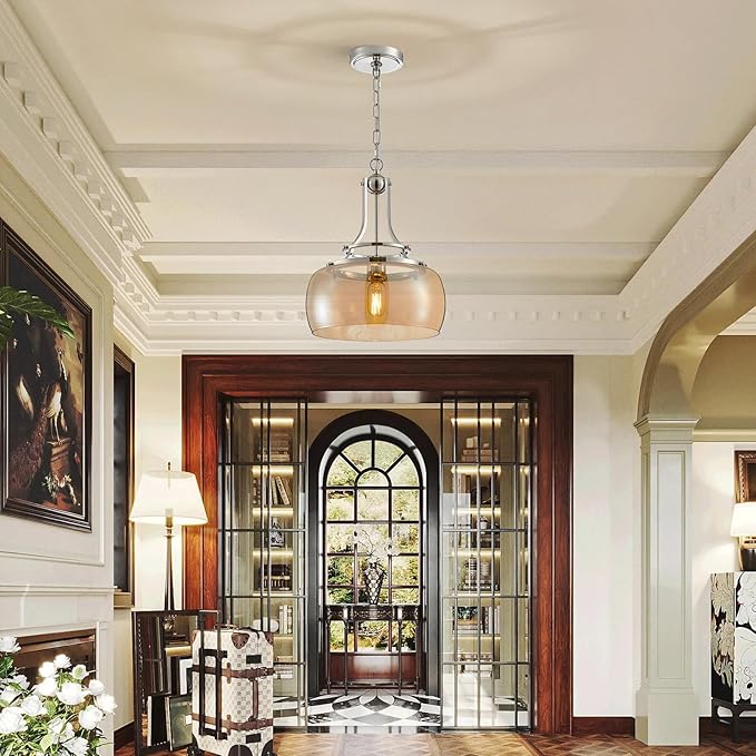 - Design: This rustic farmhouse Wuzups pendant chandelier light with design offers a modern interpretation of a classic urban-industrial style, which adds a vintage flair to your space. It comes in a nickel finish and features a prominent round amber glass shade. The mouth-blown glass has a few pinprick bubbles that add to the vintage look and feel.