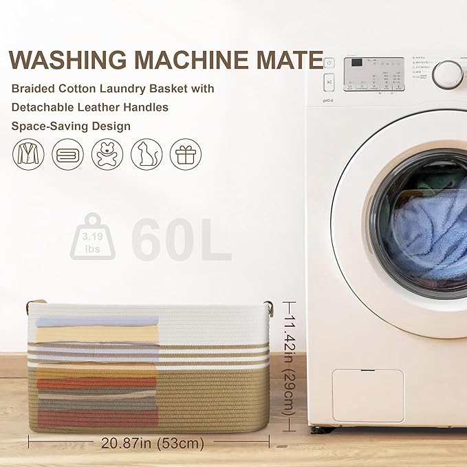 60L Large Laundry Basket with Leather Handles for Living Room Storage, Woven Rope BasketsBin for Blanket, Kids Toy, Gifts, Wicker Hamper for Bedroom Dirty Clothes, 21"x15"x11" Khaki