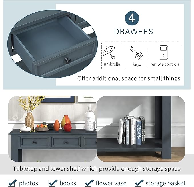 Solid Wood Console Table, Long Sofa Table Entryway Table with 4 Drawers and Bottom Shelf for Hallway Living Room Couch Table,Fully Assembled (63" Navy)