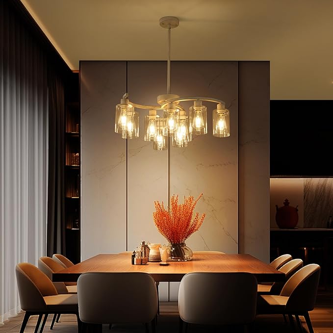 - Modern Style: White farmhouse chandelier has 3 arms that radiate outward from the central arc, presenting a simple but not simple beauty. The body of the antique metal chandelier is made of high quality metal and the surface is finished with a handmade antique white lacquer finish. The clear glass shade not only ensures the soft scattering of light, but also complements the cold and hard texture of the metal, making the whole large glass chandelier both powerful and delicate. The downward-facing glass shade does not easily accumulate dust and is easy to clean.