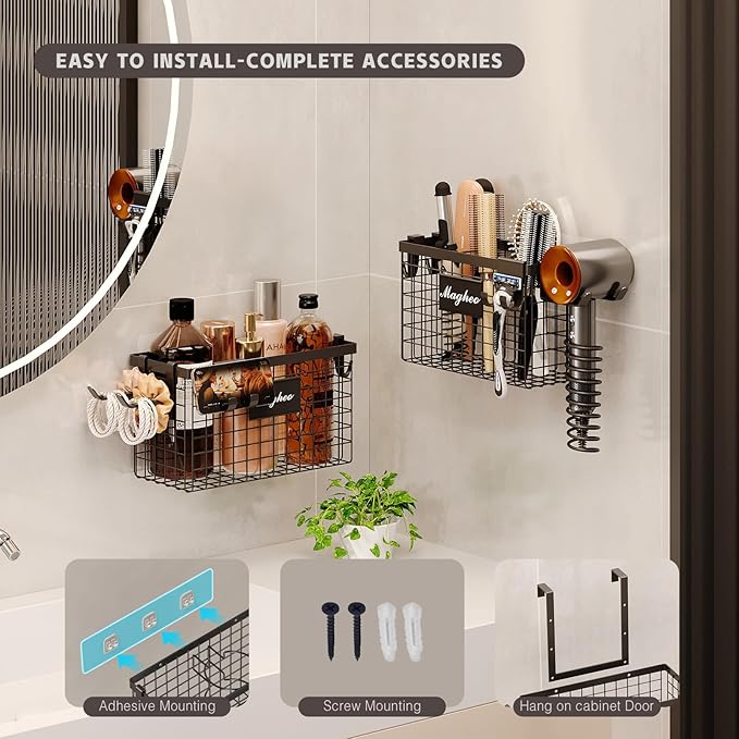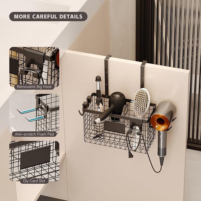 - 【3-in-1 Design】 The hair tool organizer can be used in multiple scenarios, whether above the cabinet door, mounted on the bathroom wall, or placed on the bathroom counter. It provides sturdy, stable, and durable organization for your hair appliance.