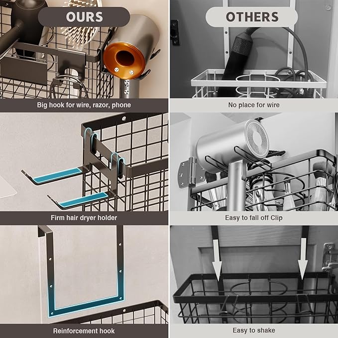 - 【Premium Metal Material】Our hair tool storage organizer is made of premium carbon steel, with anti-rust paint on the surface, which is very sturdy and durable, ensuring that it will not rust after long-term use. The grid design is high-temperature resistant and conducive to heat dissipation. Hot hair tools that have just been used can be put in immediately without waiting.