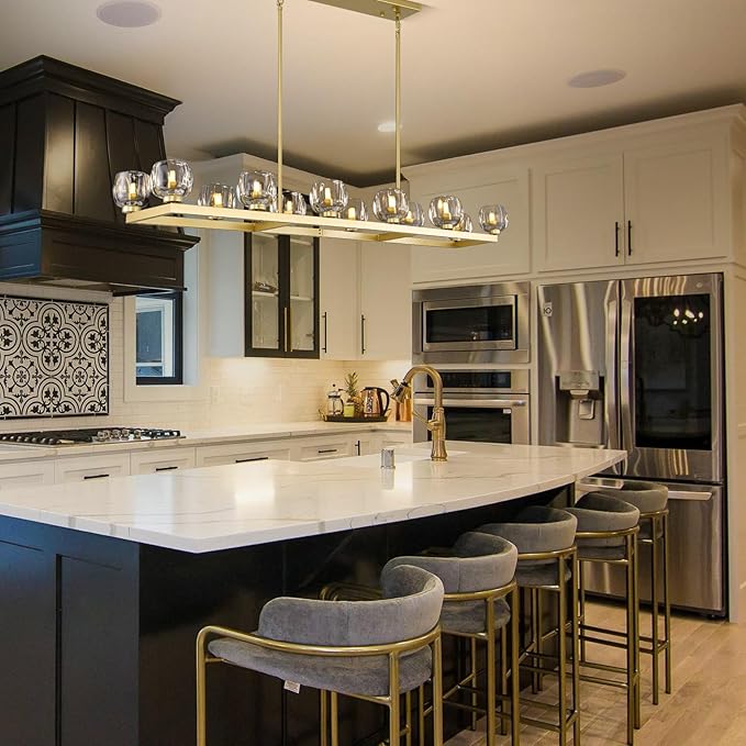 - 【Height Adjustable】Gold dining room chandelier over table measures 59 inches in length, 13.1 inches in width. It comes with 17.7-inch, 11.8-inch, and 5.9-inch rods, four of each size, max height is 77.1", weighs up to 51 pounds. Large modern chandeliers are heavy and need to be installed on a load-bearing ceiling. Perfect for modern minimalist aesthetics.