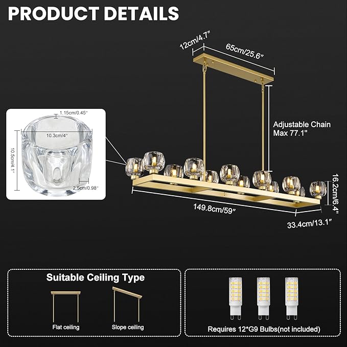 - 【12-Light Chandelier】Gold rectangle chandelier offers 360° light coverage to brighten your space & create a cozy vibe. The linear chandelier for dining room requires 12 G9 bulbs and available for infinite dimming via a dimmer. (Dimmable bulbs & dimmer not included).