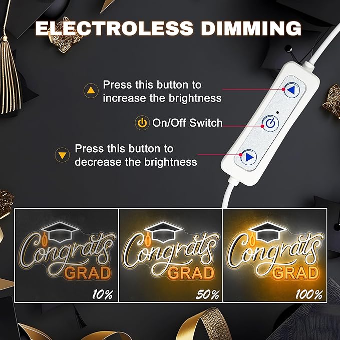 - The stylish "CONGRATS GRAD" font adds a modern touch suitable for various celebrations like graduations and birthday parties. Easy Installation & Portable Use - Equipped with hanging strings and screws, this neon sign can be easily mounted on walls or fixed on wall.