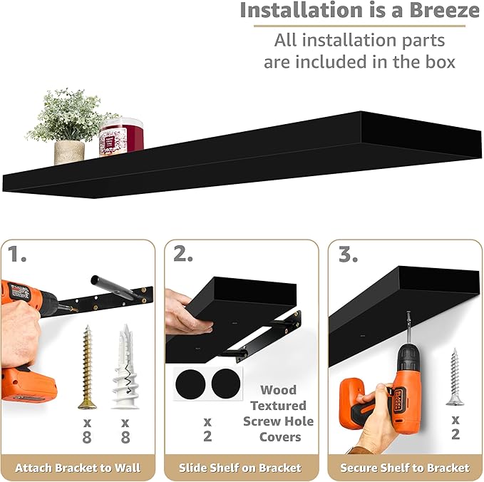 - Easy to Install: Minor assembly required, detailed instructions included. Hanging shelves are made of beautiful, engineered faux wood (not solid wood) with a smooth matte finish. Enhanced steel brackets attach firmly to the wall. Sturdy enough to hold up to 22 lbs. Mounting hardware INCLUDED. Color of bathroom shelf may be slightly different from the product photos due to lighting and screen settings